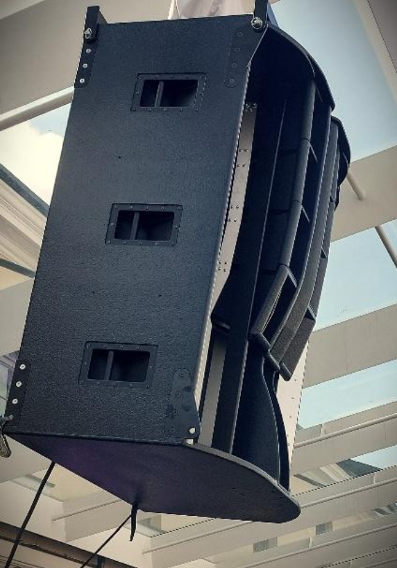 146dBpeak in free space (4Pi). Powered by 15kW dedicated processed amplifier power per cabinet.